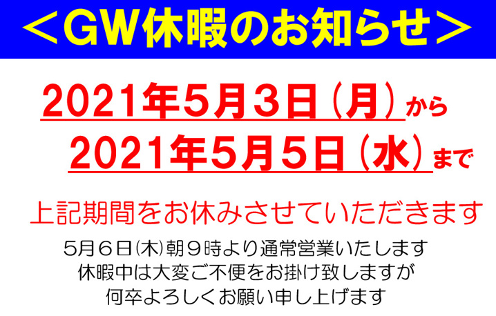 有限会社春日不動産 > (有)春日不動産のスタッフブログ記事一覧 > GW休暇のお知らせ(5/3~5/5)
