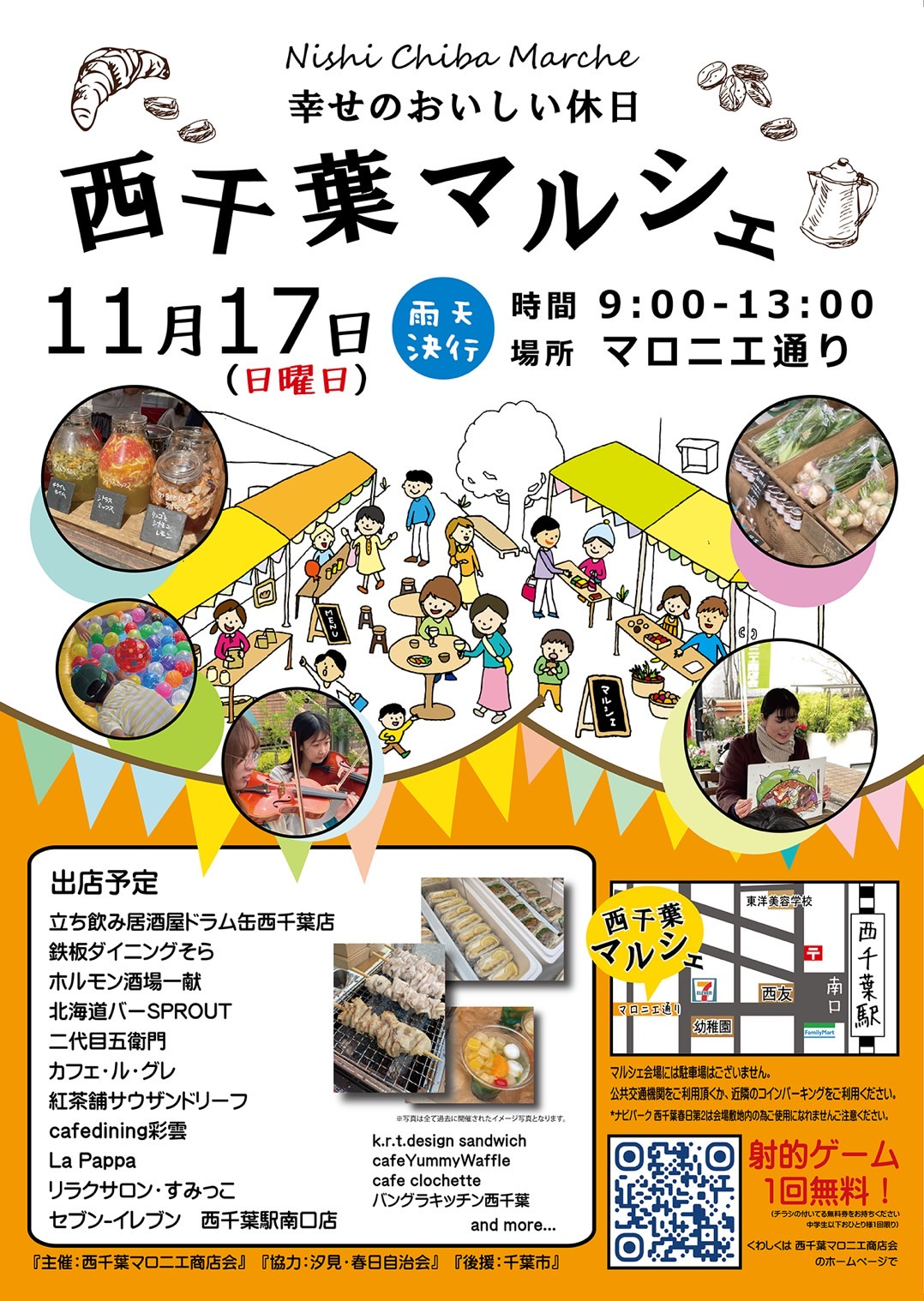 地元西千葉の色々な飲食店さんが出店されます!美味しいお弁当やお菓子だけでなく、前回好評だった射的ゲームもあるそうです!ぜひ足を運んでみて下さい!