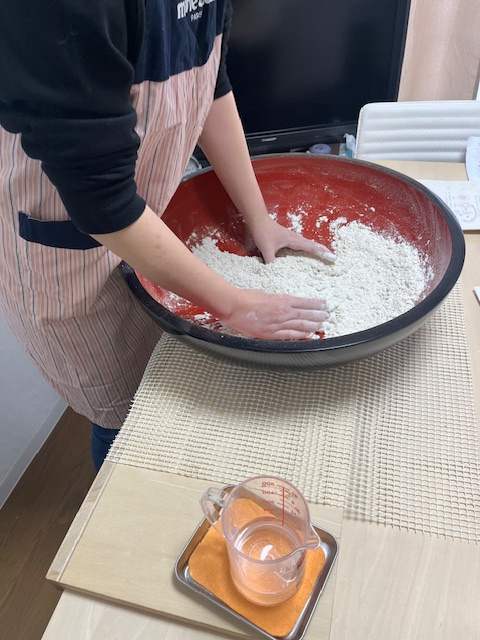 母も孫と蕎麦打ちができることがうれしくて仕方ないようでワチャワチャと楽しそうに作業をしていました。